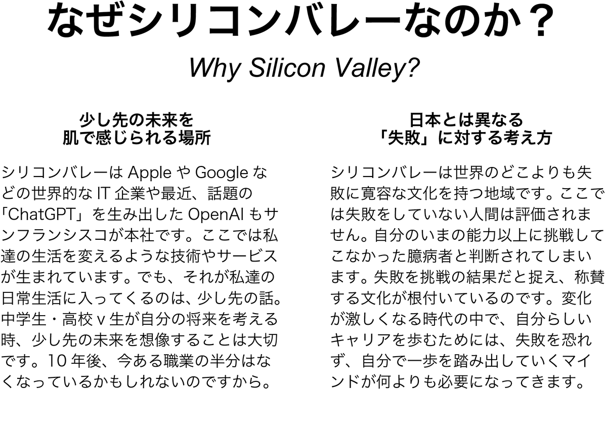 シリコンバレーはAppleやGoogleなどの世界的なIT企業や最近、話題の「ChatGPT」を生み出したOpenAIもサンフランシスコが本社です。ここでは私達の生活を変えるような技術やサービスが生まれています。 でも、それが私達の日常生活に入ってくるのは、少し先の話。中学生・高校生が自分の将来を考える時、少し先の未来を想像することは大切です。10年後、今ある職業の半分はなくなっているかもしれないのですから。